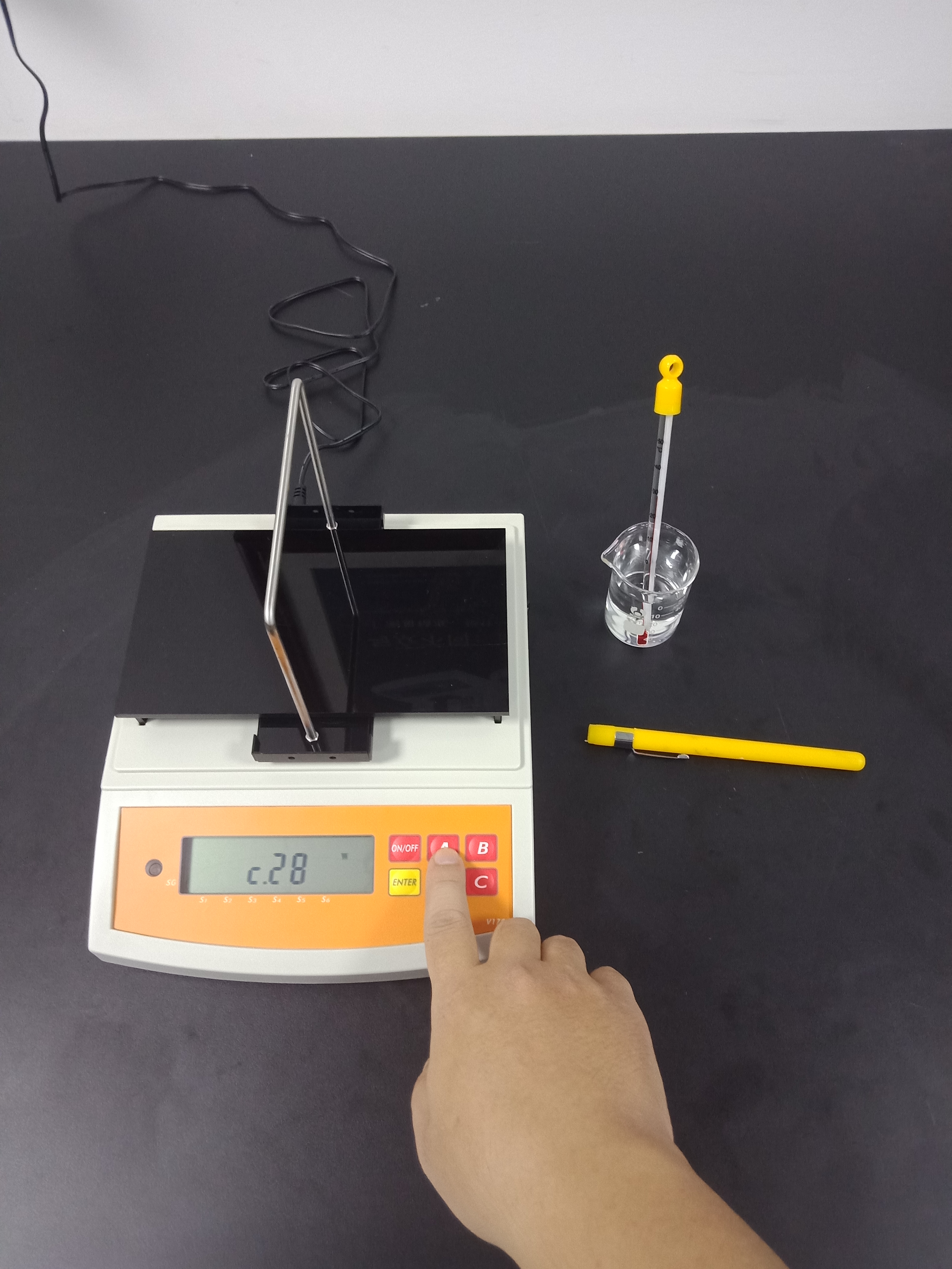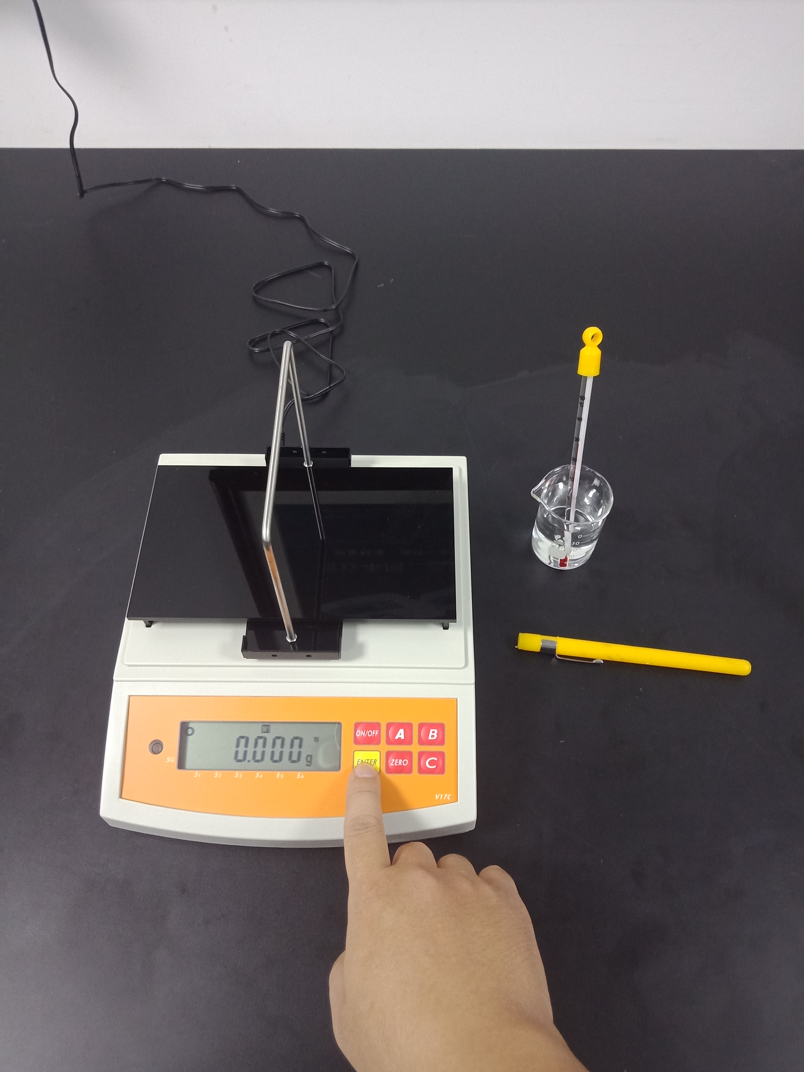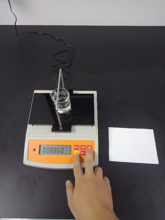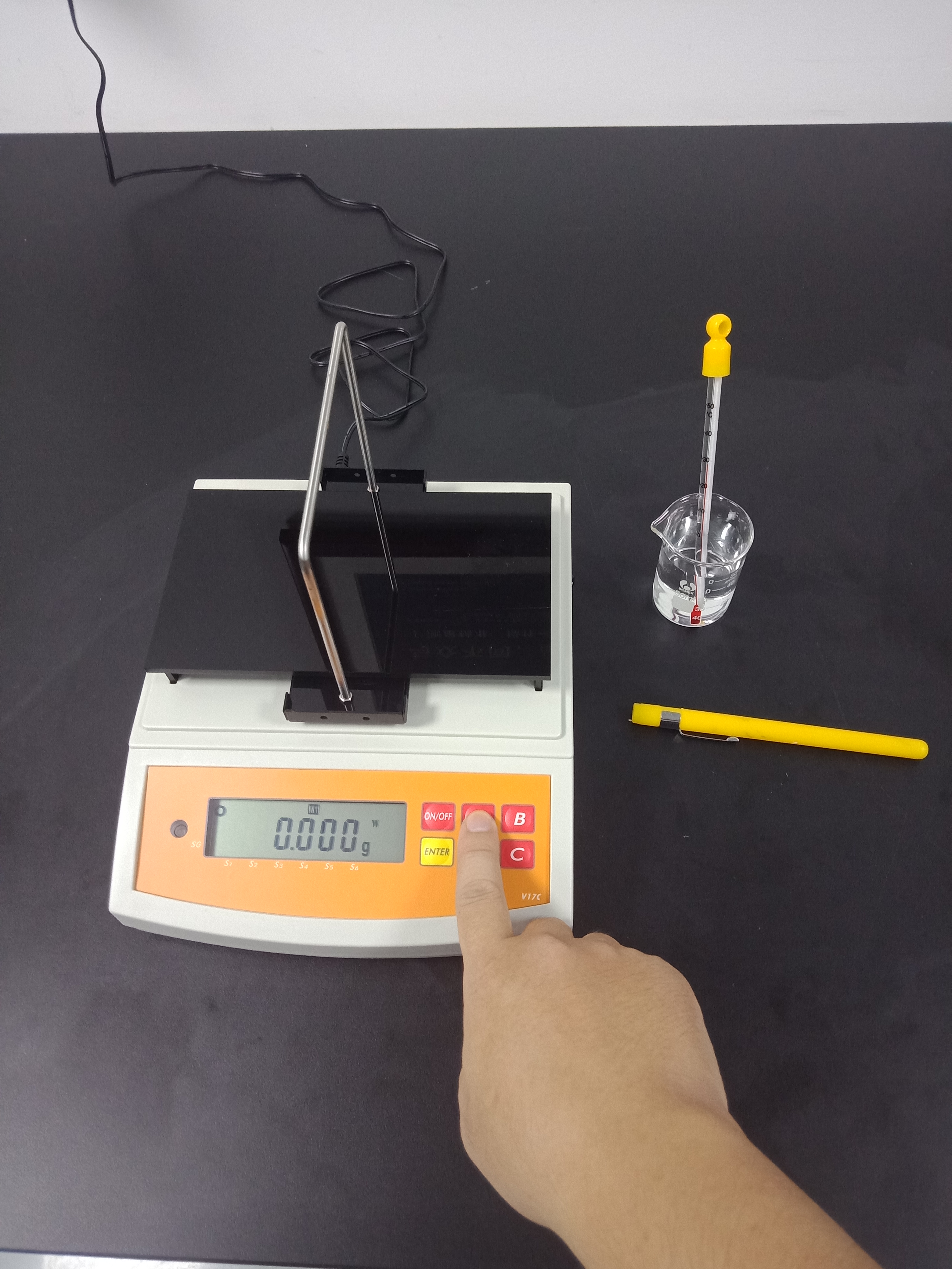 3),記錄好測試結(jié)果后,再按一次【ENTER】鍵返回待測模式,并將已測液體樣品,掛鉤和測試用砝碼取下,結(jié)束此次測試,如下圖