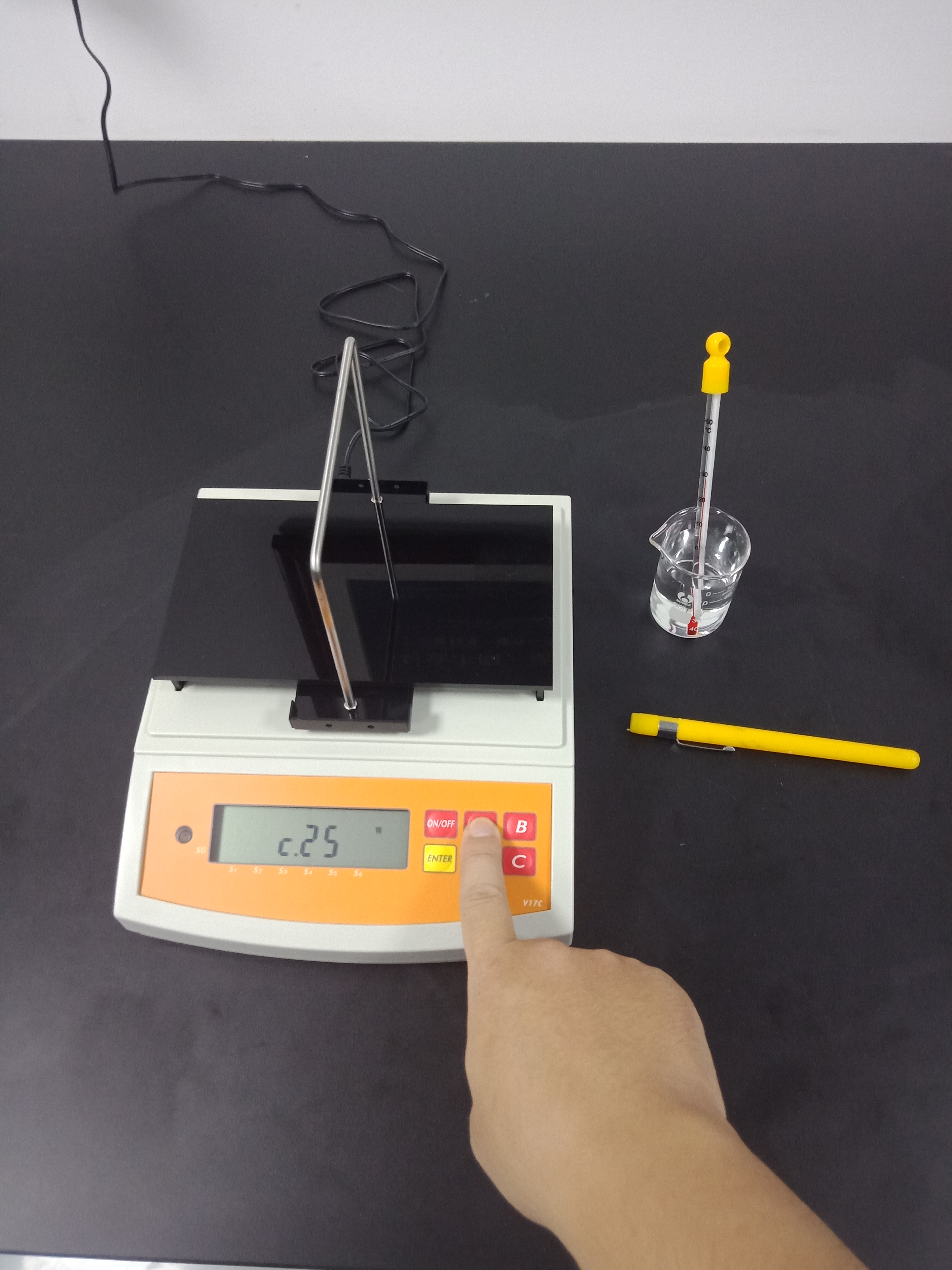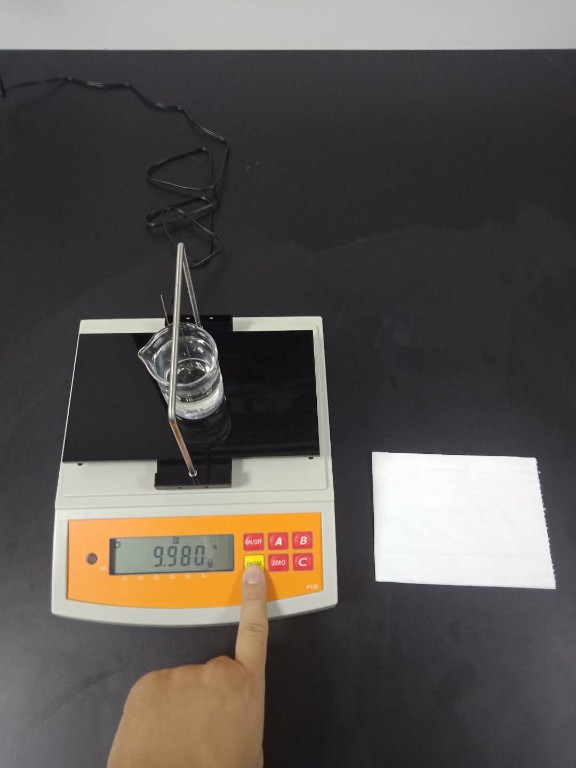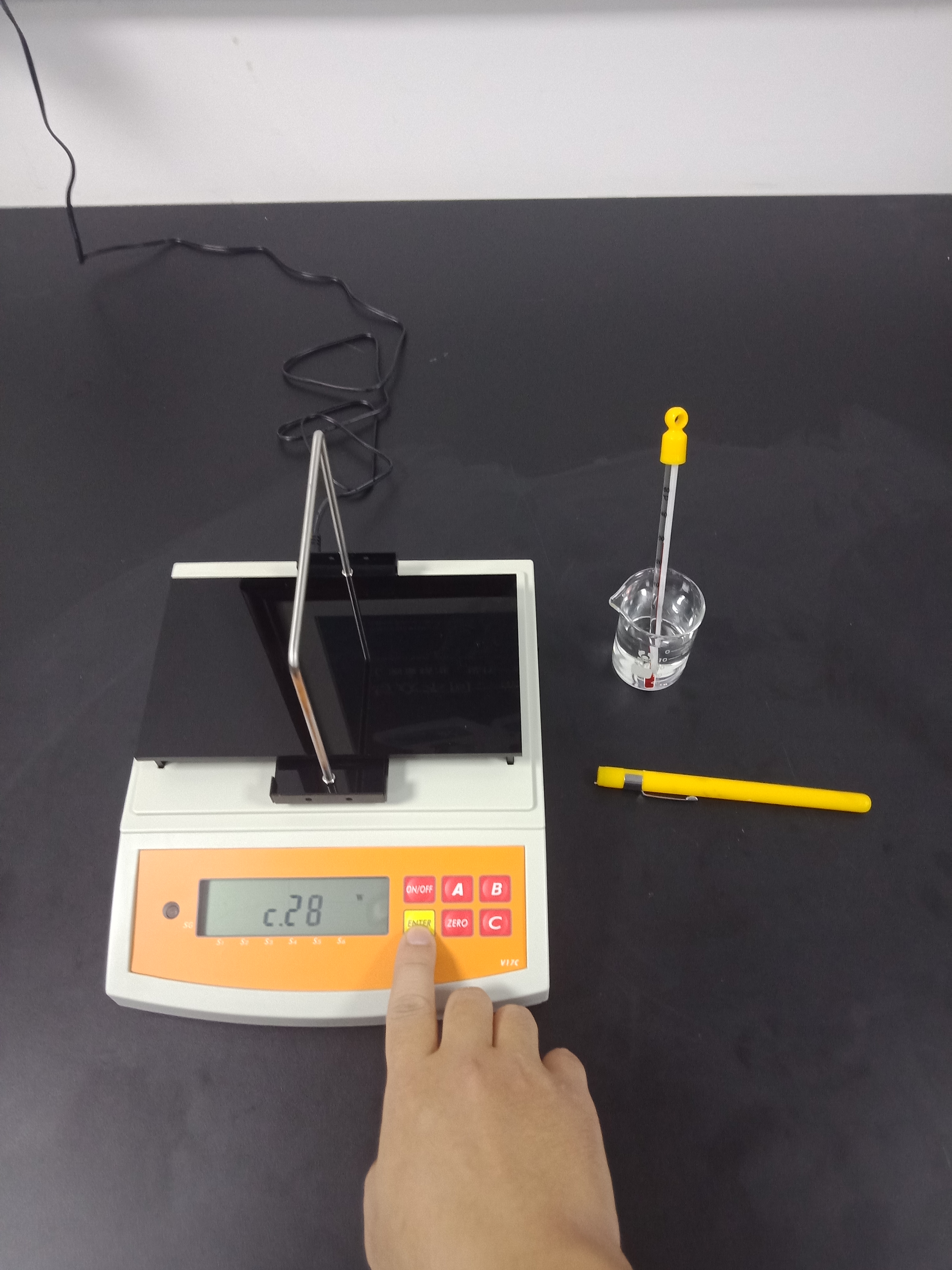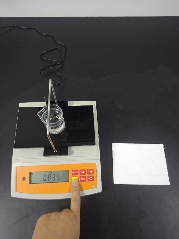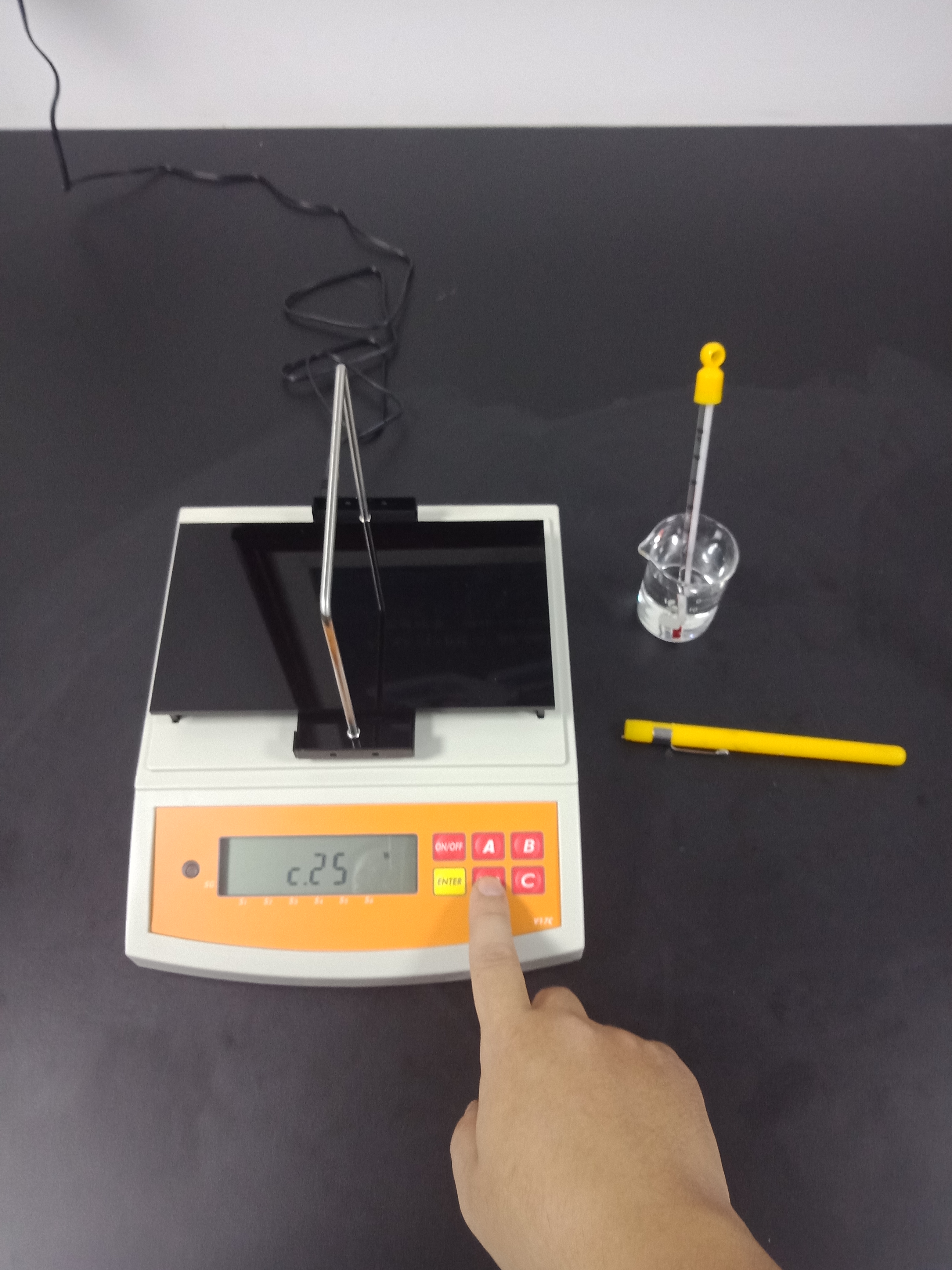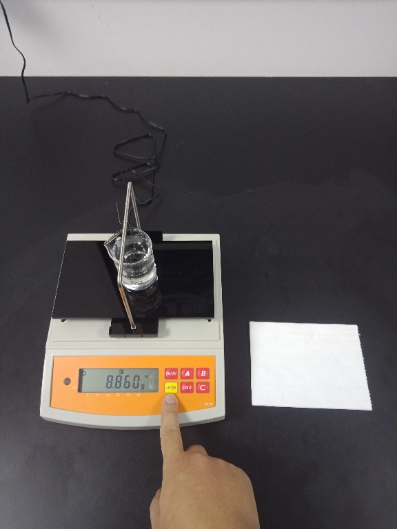 3),記錄好測試結(jié)果后,再按一次【ENTER】鍵返回待測模式,并將已測液體樣品,掛鉤和測試用砝碼取下,結(jié)束此次測試,如下圖