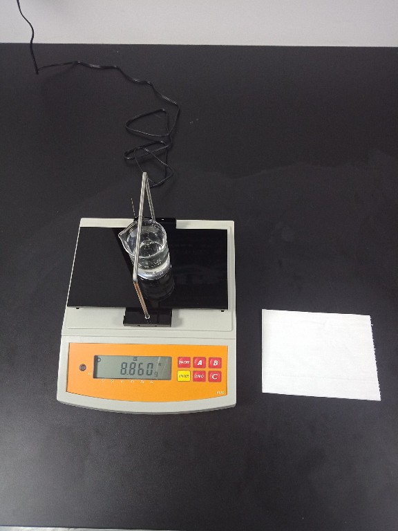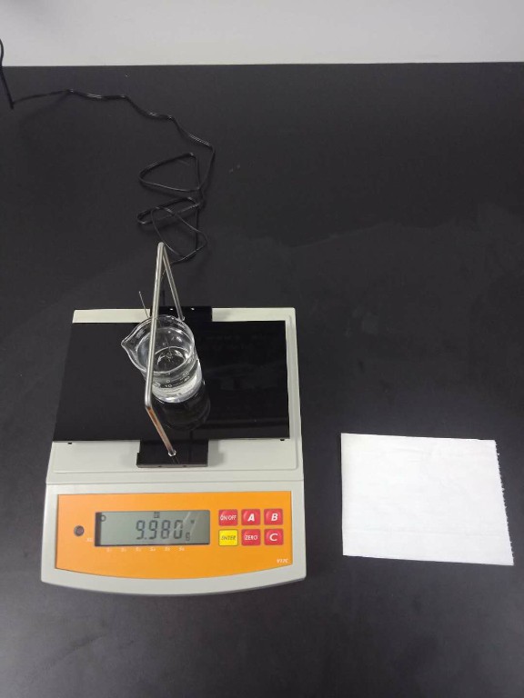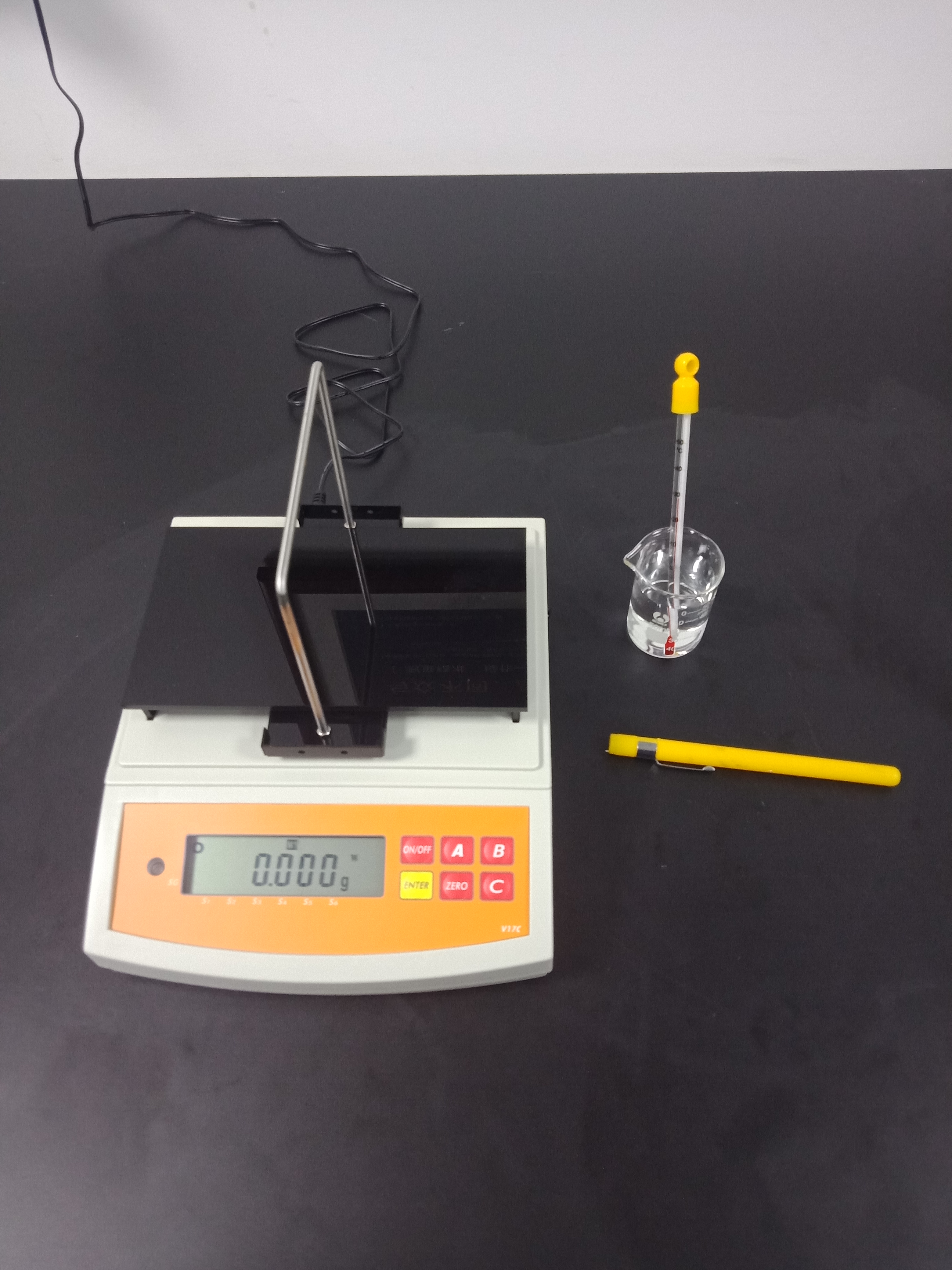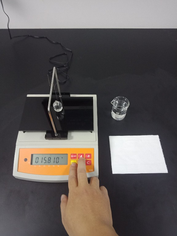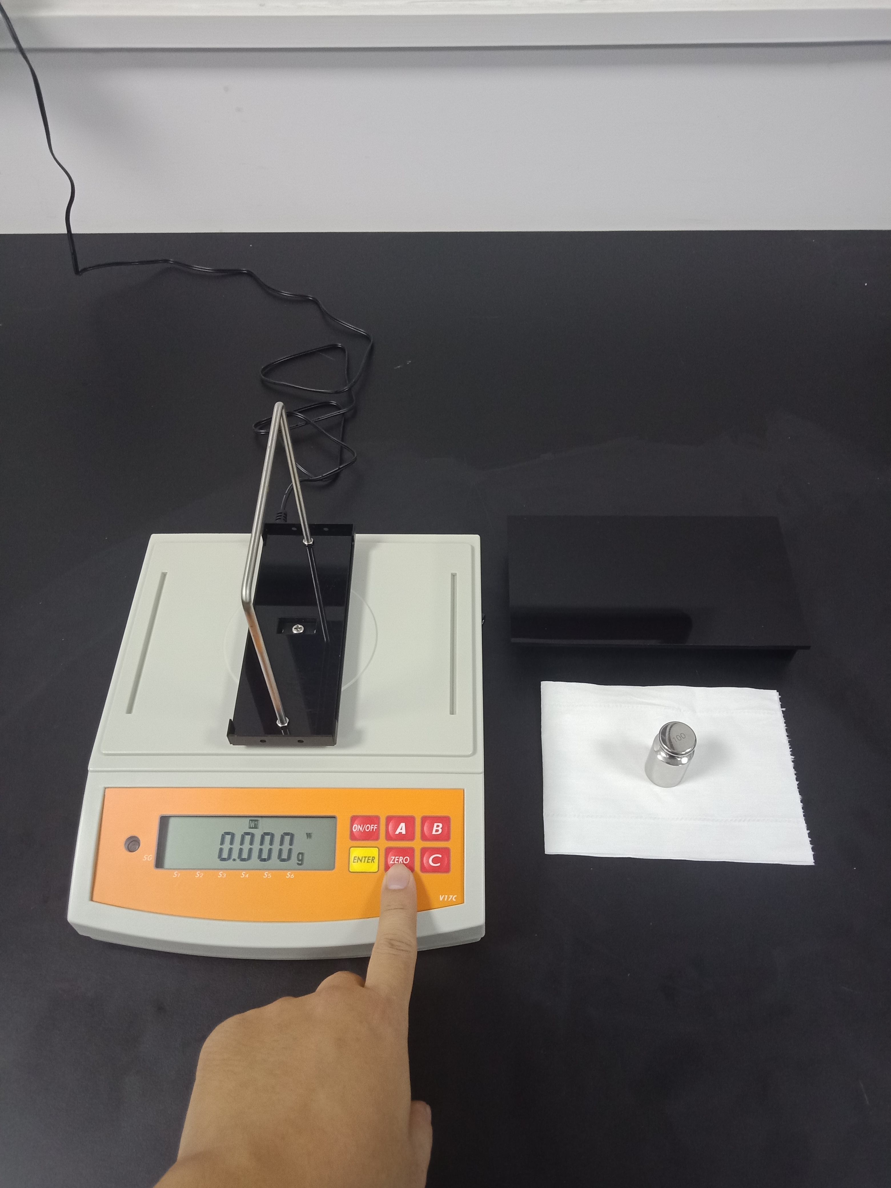 3),記錄好測試結(jié)果后,再按一次【ENTER】鍵返回待測模式,并將已測液體樣品,掛鉤和測試用砝碼取下,結(jié)束此次測試,如下圖