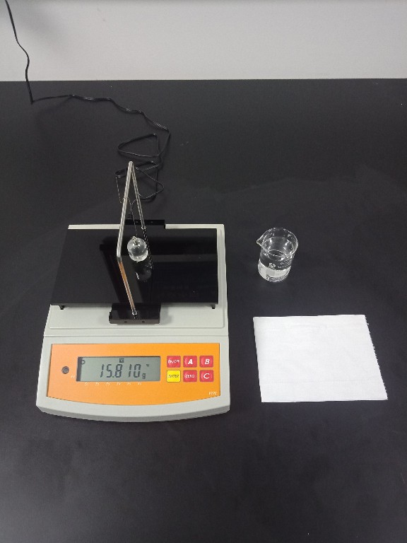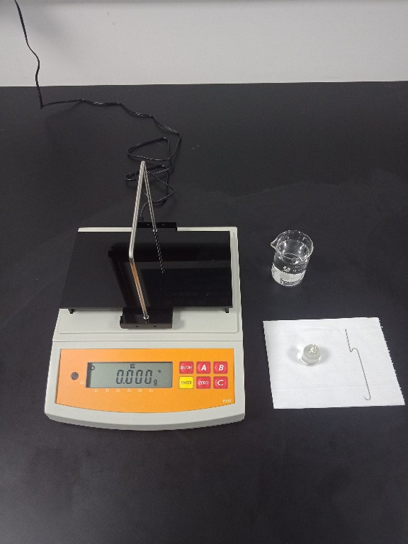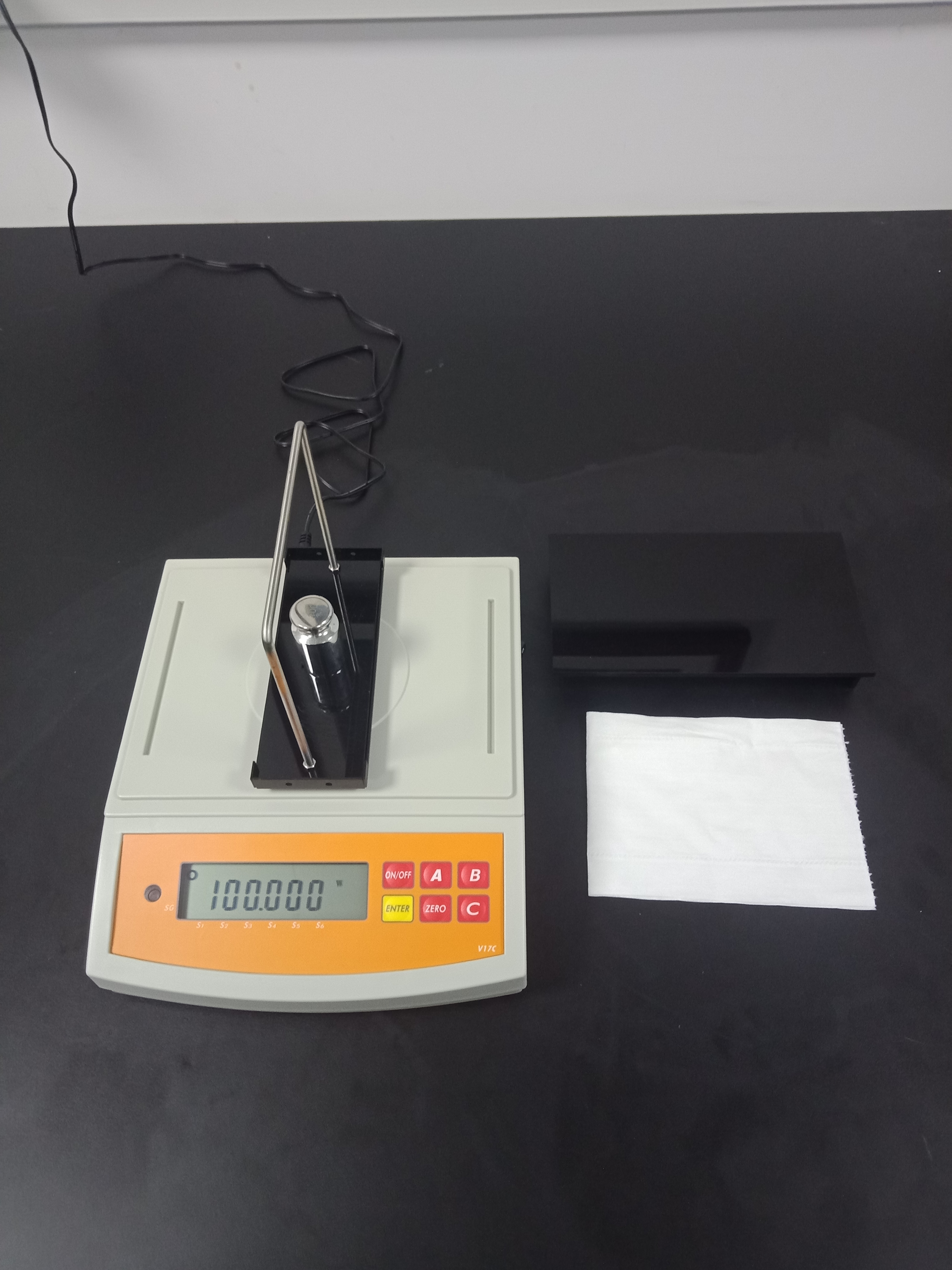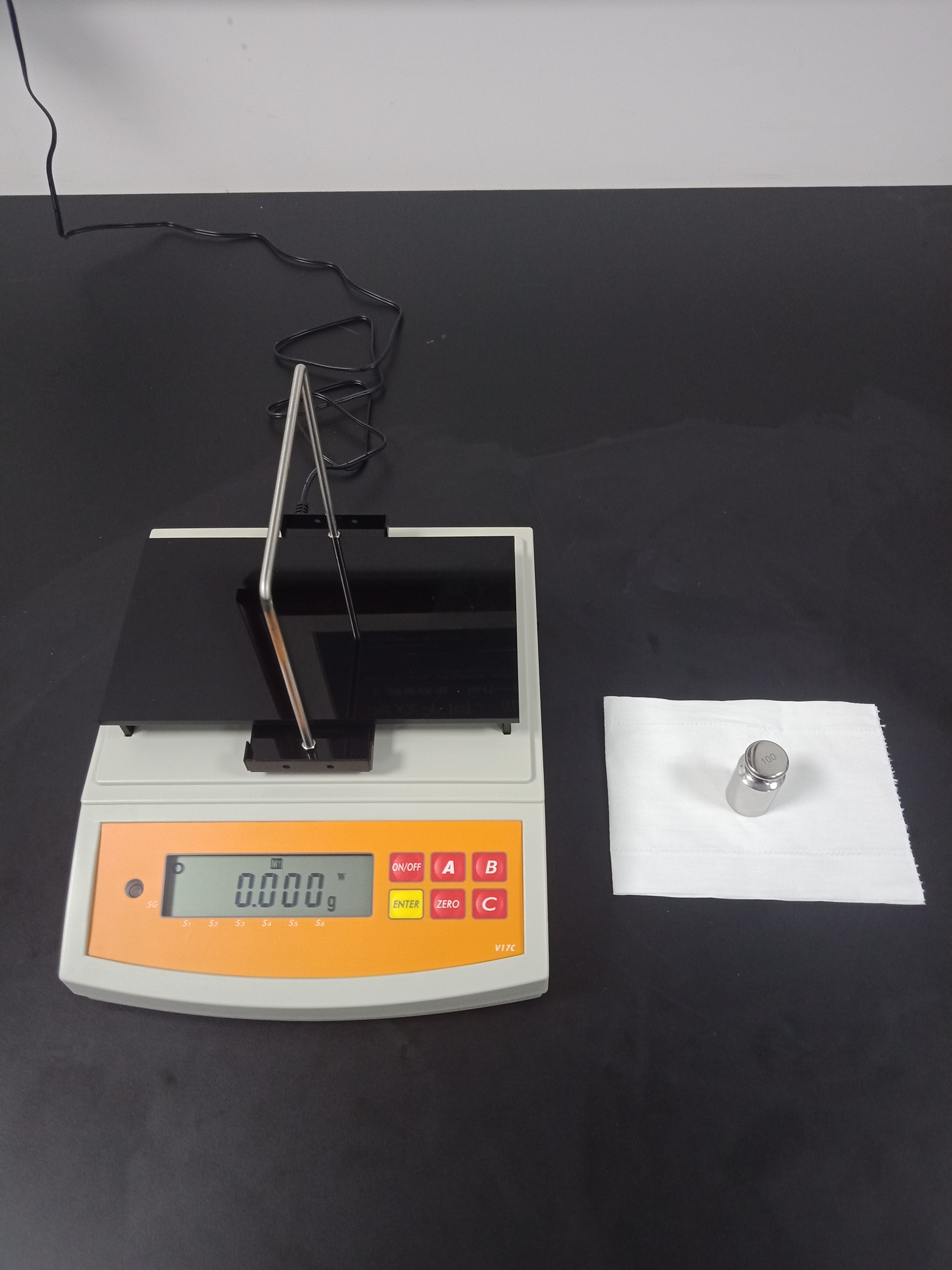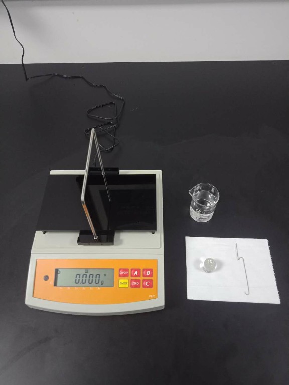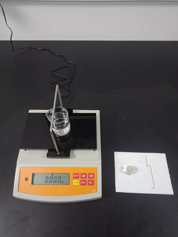 1),準(zhǔn)備一杯待測液體樣品,已標(biāo)定好的標(biāo)準(zhǔn)測試用砝碼,例如圖中的玻璃砝碼,和掛鉤一個(gè),如下圖