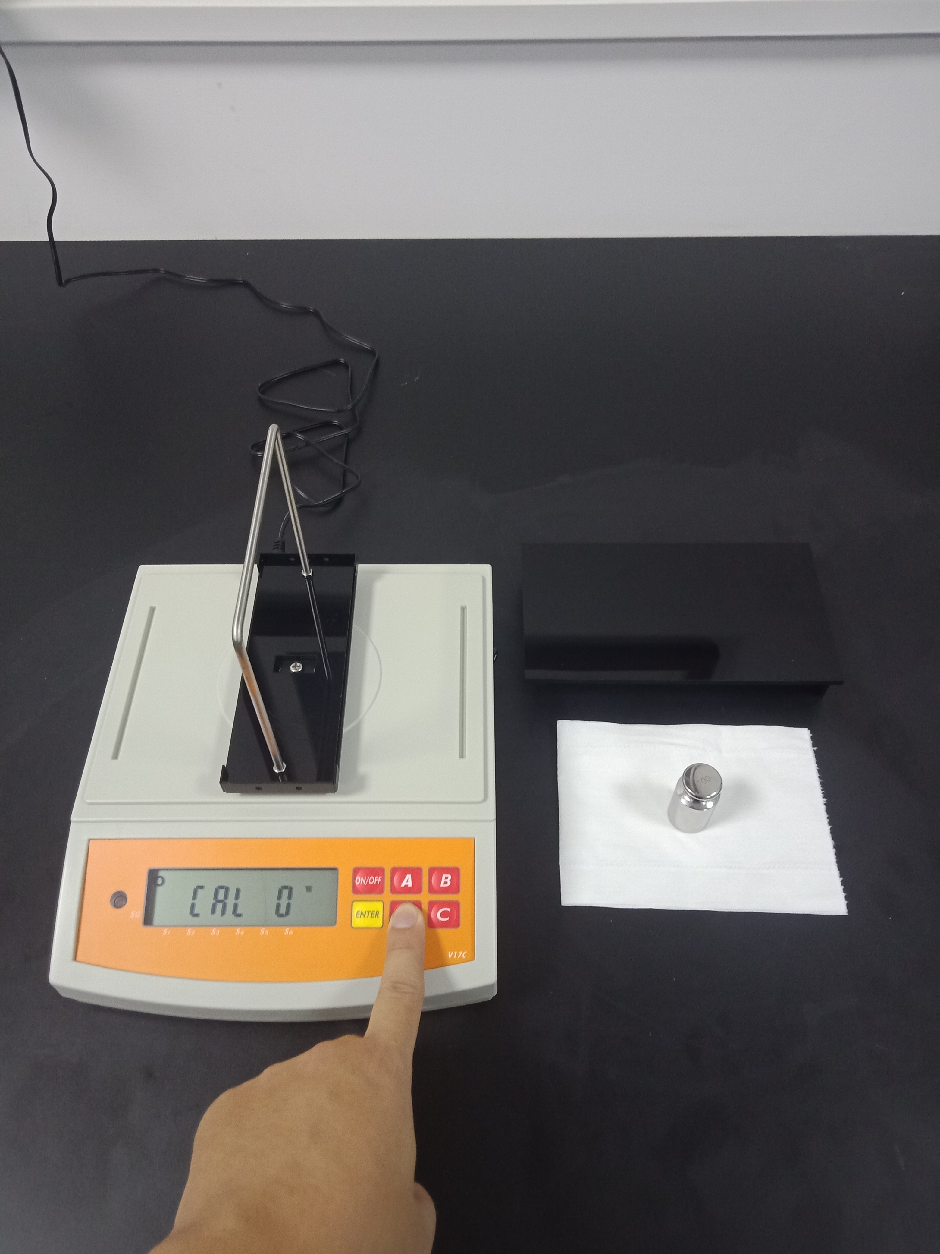 等待屏幕顯示從【CAL 0】轉(zhuǎn)換成【100.000】閃爍后,將100g標(biāo)準(zhǔn)重量砝碼放到測量架正中間處,儀器會(huì)自動(dòng)進(jìn)行校準(zhǔn),校準(zhǔn)結(jié)束后,屏幕顯示的【100.000】停止閃爍(圖1)
