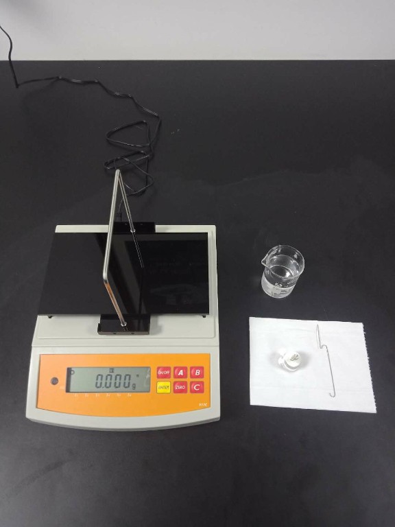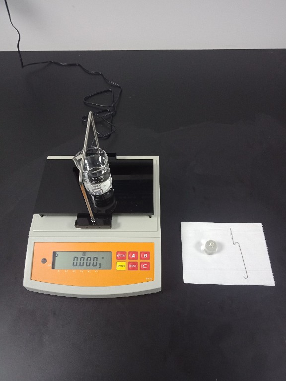 1, 用50ml的燒杯裝50ml的純凈/蒸餾水,準(zhǔn)備好測試用的玻璃/不銹鋼砝碼(演示操作中用的是玻璃砝碼)和掛鉤一個(gè),如下圖: