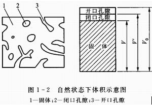 V0—— 材料在自然狀態(tài)下的體積,包括材料實體及其開口孔隙、閉口孔隙,見圖1-1,m3或cm3。