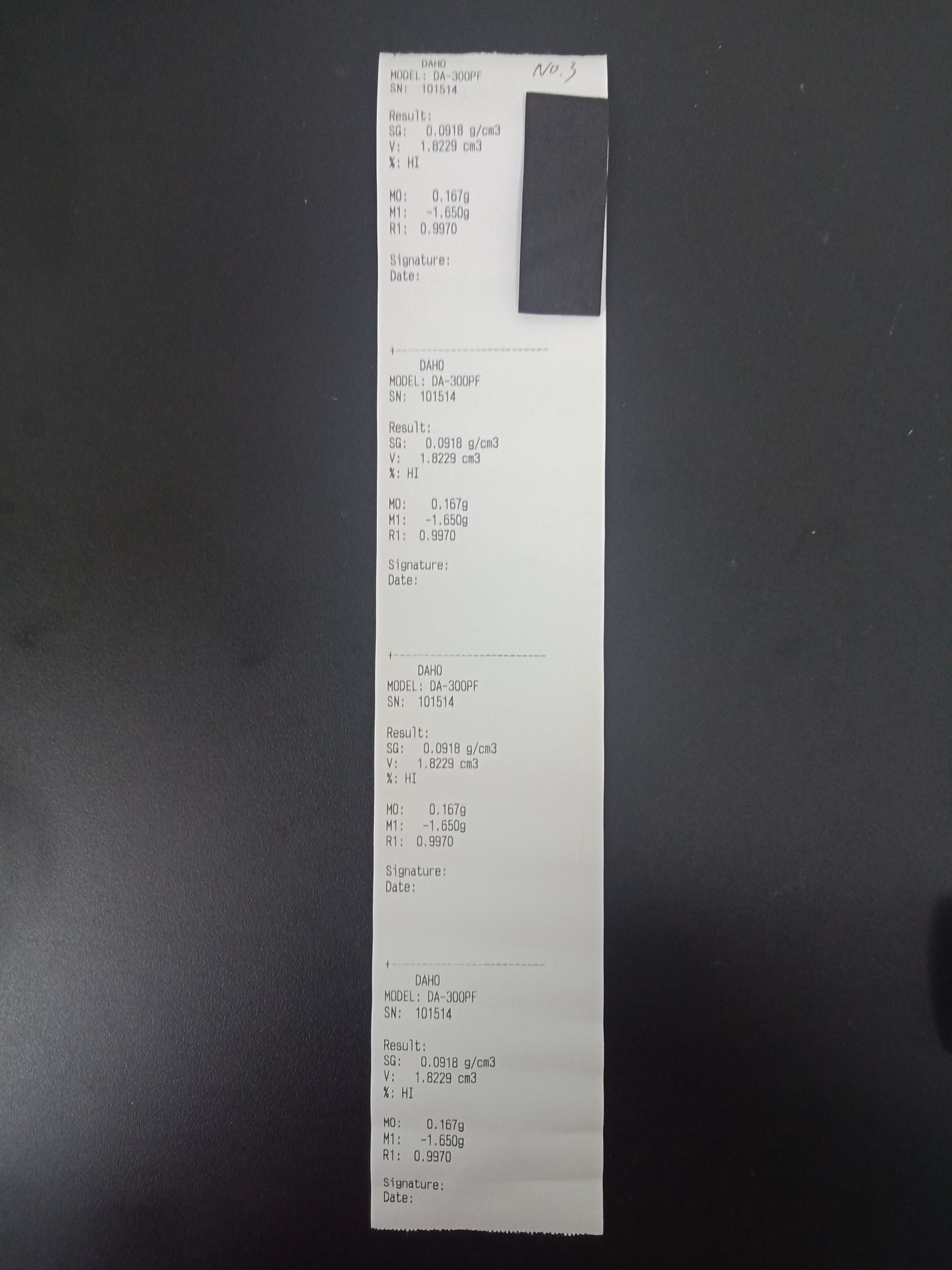 第二步:將測試樣品放入水中吊籃上的抗浮架下方,待重量穩(wěn)定后,按ENTER鍵,儀器記錄重量數(shù)據(jù),數(shù)據(jù)記錄完成后,儀器將會自動計算樣品的密度值,并將計算出來的密度值結(jié)果顯示在屏幕上,并可用打印機打印出來,如圖3顯示,此EVA材料樣品的密度值是:0.0835g/cm3