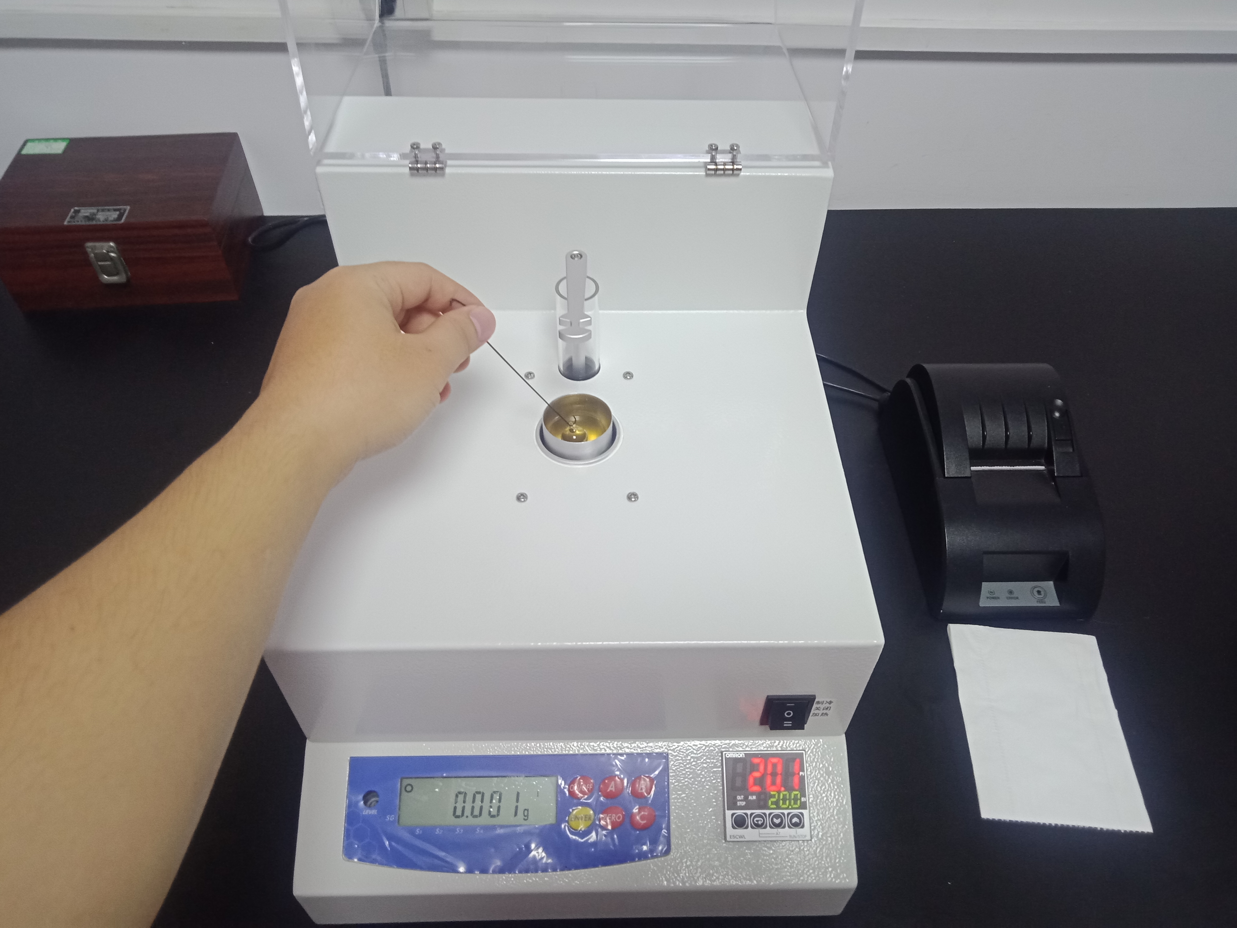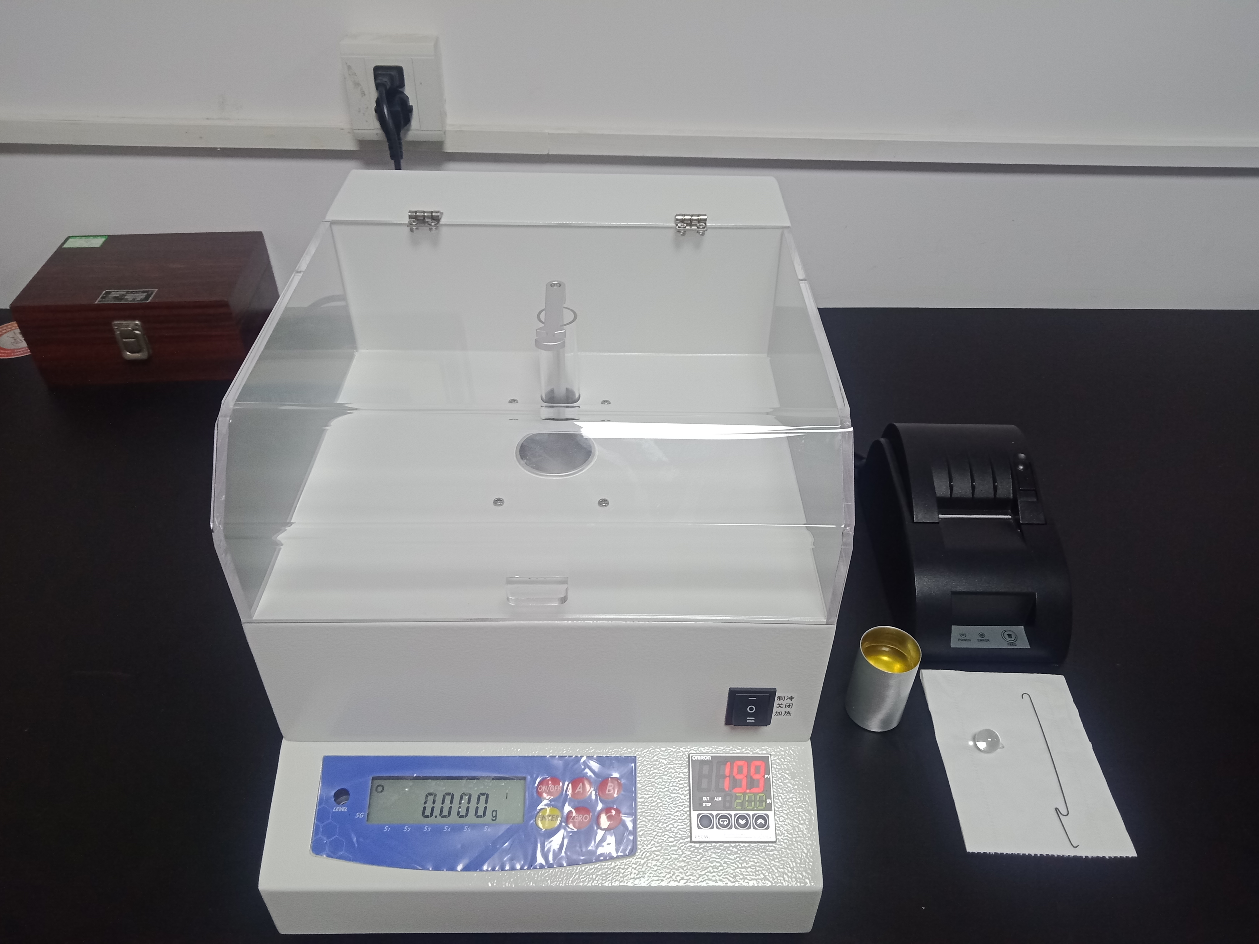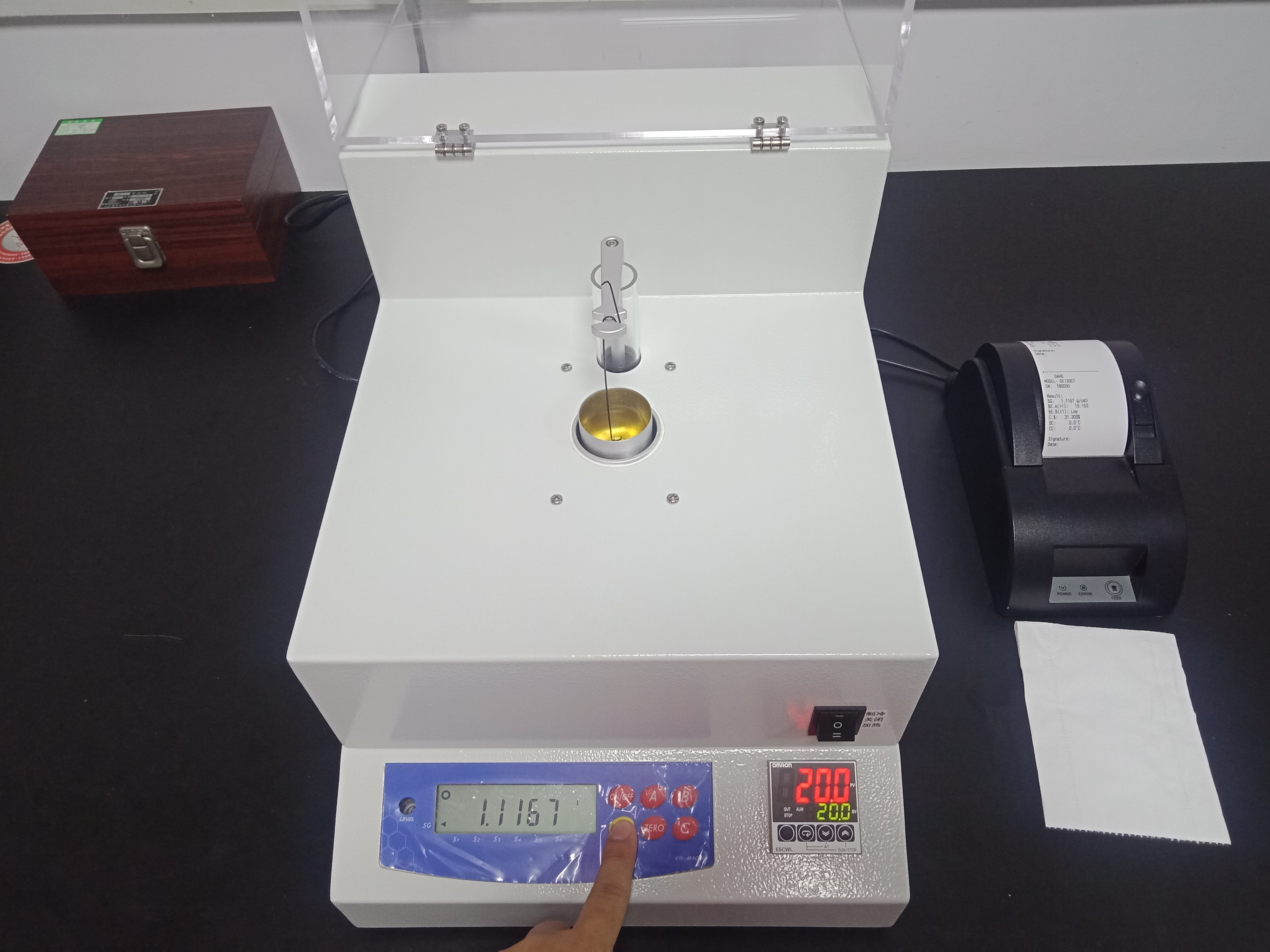 3,恒溫到20℃后,將已經恒溫好的掛鉤和砝碼掛在測試支架上,砝碼完全浸沒在待測溶液中,然后按ENTER鍵,儀器會將雙氧水(過氧化氫)的濃度值顯示在屏幕上,打印機會將測試的詳細數據打印出來