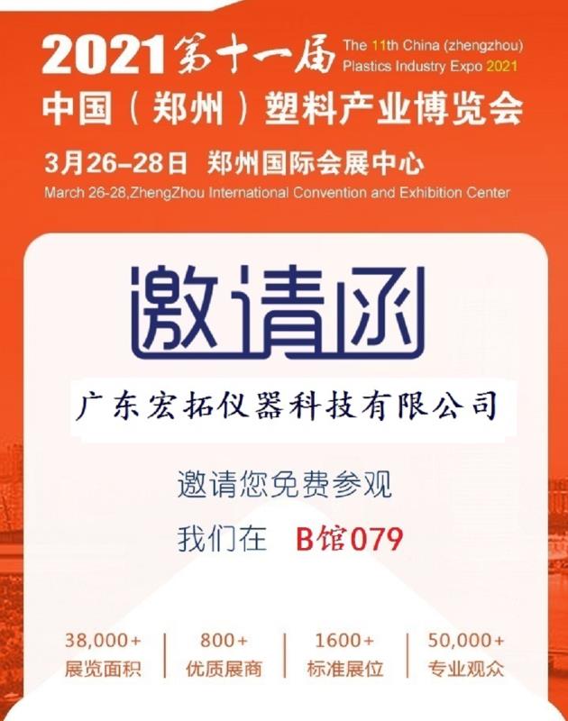 廣東宏拓儀器科技有限公司應邀參加2021第十一屆中國(鄭州)塑料產業博覽會,該展會將在3月26日-28日的鄭州國際會展中心開展,歡迎廣大新老客戶屆時到位于鄭州國際會展中心B館079號廣東宏拓儀器科技有限公司展位參觀和了解公司參展儀器。