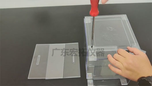 6、把密度計(jì)放入防風(fēng)罩里面,放入兩塊活動(dòng)板,安裝防風(fēng)罩完成。