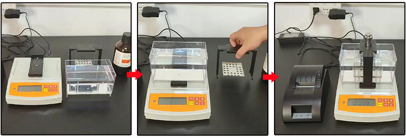 5、將裝有顆粒的網(wǎng)球放入水中吊欄中央(注意觀察樣品表面不能有氣泡產(chǎn)生,有氣泡需及時清除),玻璃杯放入測量架上。