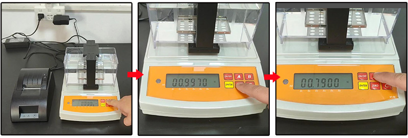 1、在0.000狀態(tài)下,屏幕上M1閃爍,將網(wǎng)球放入水中吊欄中央,玻璃杯放入測量架上,穩(wěn)定符號“0”顯示后,按【ZERO】鍵扣除玻璃杯和網(wǎng)球的重量。