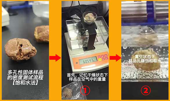 2,在顯示0.000狀態下,輕輕用鑷子把巖石樣品放在密度計的測量架上,待重量穩定后,按鍵自動記錄空氣中的重量,如圖①