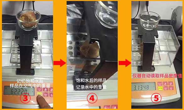 4,待巖石樣品吸飽水后,再測試放入測量架上,待重量穩定,按鍵自動記錄數據。如圖③